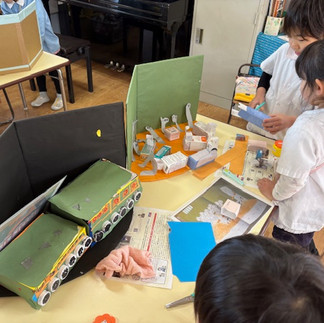 うさぎ組、遊具の下に、いろいろ運び込んで、おうちにしてます