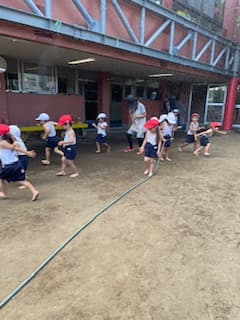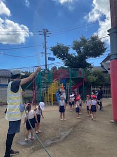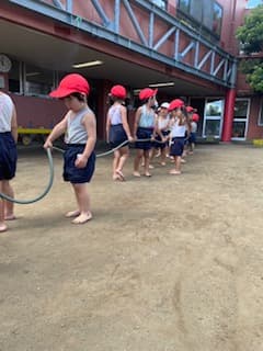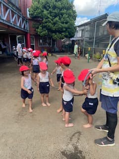 慰霊塔で練習している年長さんを見てるうさぎ組さん