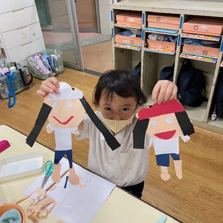 年長、運動会の絵、画用紙を切って自分を作ります。